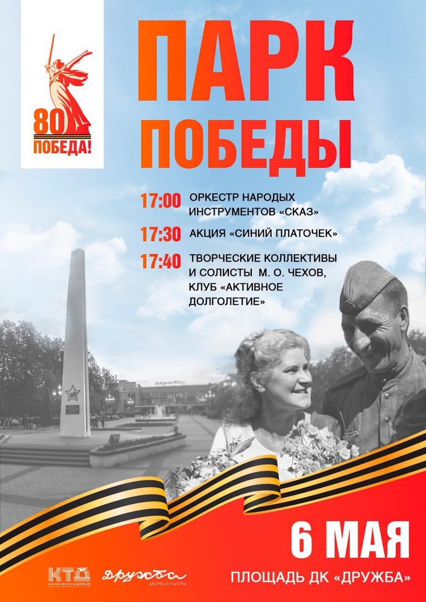 ✨ "Парк Победы" – театрализованная ретроспектива 📢 В 17:00 приходите на акцию Синий платочек и концертную программу. 🚫 Возраст: 0+ 📆 06.05.2025 🕛 17:00 🏢 ДК «Дружба» 📍 г. Чехов, ул. Чехова, д.45 🪙 Вход свободный❗️ ✅ Мероприятия Чехов https://dzen.ru/id/66cc4b48e9ef144699238a51 http://vk.com/chekhov_events http://dzen.ru/chekhov_events