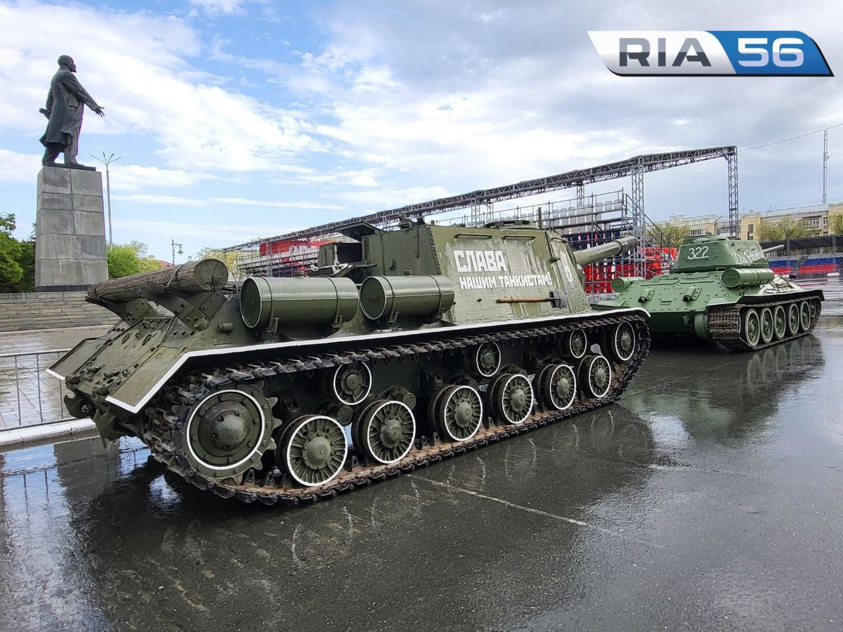Сегодня на площади Ленинав Оренбурге появились танки, которые проедут по площади на параде Победы. Это легендарный Т-34 и ИСУ-152 с надписями: "За Родину!" и "Слава нашим танкистам!". А также на площади Ленина закончен монтаж сцены и трибун к параду Победы, который состоится 9 мая в 10:00.