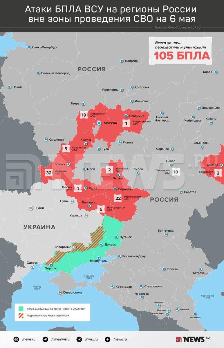 105 украинских БПЛА уничтожили силы ПВО над регионами РФ, сообщают в Минобороны.