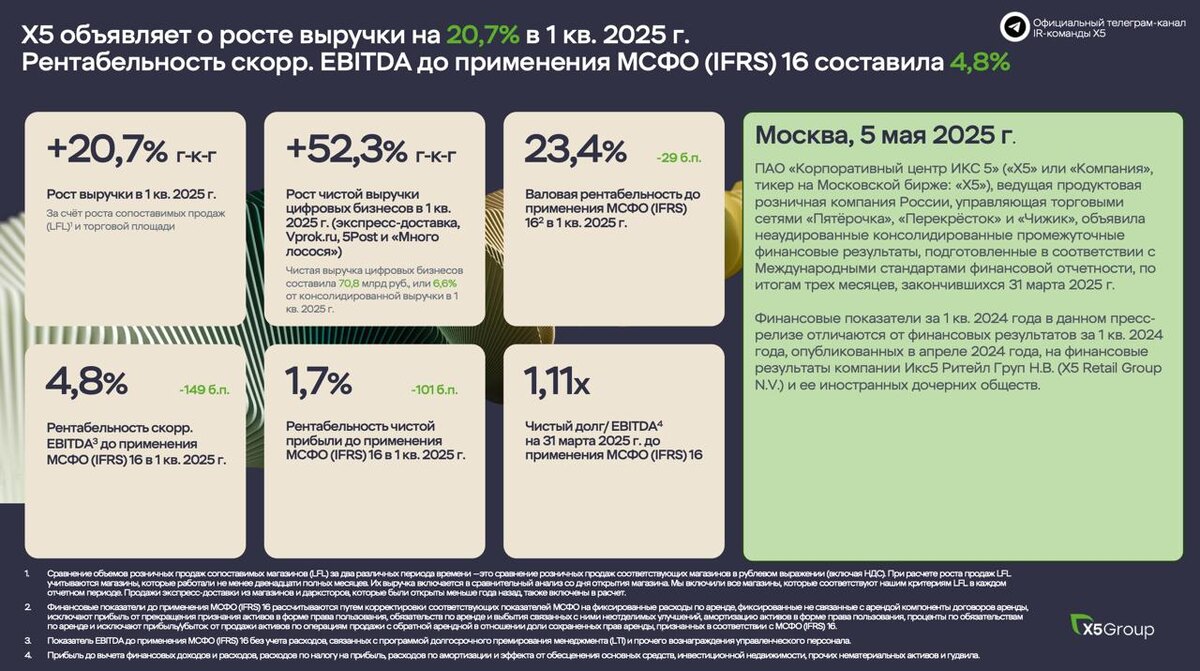 Сезон корпоративной отчетности за первый квартал 2025 года стартовал. Одной из первых в ритейле свой отчет представила «ИКС5», его то мы сегодня и разберем. Отрадно видеть, что компания продолжает свой поступательный рост и радует нас дивидендами, но обо всем по порядку. 🍏 Итак, выручка X5 за первый квартал 2025 года выросла на 20,7% до 1,1 трлн рублей, снова обогнав продуктовую инфляцию и сохранив темпы роста выше 20%. Также компании удалось нарастить и сопоставимые продажи (LFL). Средний чек и трафик выросли на 9,6% и 4,6% соответственно. Увеличение реальных доходов населения драйвит рынок продовольствия, где X5 является безоговорочным лидером. При этом выручка «Чижика» приросла за отчетный период сразу в два раза до 90 млрд рублей, при одновременном увеличении торговой площади на 51,8%, а выручка «цифровых бизнесов» на 52,3%. В компании считают, что жесткие дискаунтеры, готовая еда и цифровые бизнесы – это ключевые точки роста российского ритейла. Современные реалии требуют от все