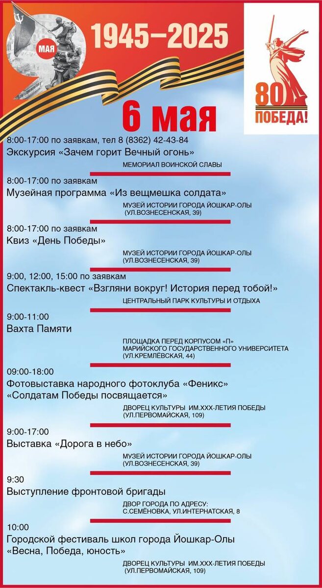 В Йошкар-Оле уже начались праздничные мероприятия в преддверии Дня Победы. Делимся афишей.