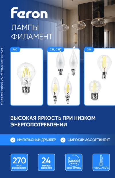 Светодиодные лампы филамент от компании Feron в ЮгКабель. В наличии широкий ассортимент качественных светодиодных ламп филамент бренда Feron: А60, свеча и свеча на ветру, шарики с цоколем Е14 и Е27 с прозрачной и матовой колбой. Нужно отметить наличие IC драйвера, эффективное отведение тепла от корпуса и долгий срок службы светодиодов (40 000 часов). Преимущества филаментных светодиодных ламп Feron: ✅Самые яркие лампы в своем классе ✅Высокая цветопередача ✅ Не выходят из строя при частых перепадах напряжения Идеальное решение для хрустальных люстр и открытых светильников, в которых источник света является частью дизайна. Применяются как для общего, так и для декоративного освещения. Реклама. Рекламодатель ООО «ЮГКАБЕЛЬ» ERID: 2VtzqvwzmrT. #Feron #югкабель #светодиодныелампы #ремонт #монтаж