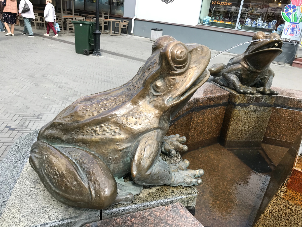 На улице Баумана в центре Казани расположены красивые фонтаны. Они радуют туристов, дают возможность сделать великолепные фотографии, вызывают восторг у детей и освежают воздух в жаркий день. Из фонтанов пьют птицы, в воде отражаются старинные здания, и всё это очень оживляют шумную и суетную, хотя и пешеходную, улицу. Идея создания искусственных фонтанов возникла у людей в глубокой древности. Изначально их делали в садах, окружающих дворцы, и предназначались они для полива выращиваемых растений. Время меняет всё – и с годами фонтаны стали обязательными элементами городских парков и скверов. Даже на центральных улицах городов устанавливают их, и теперь фонтан выполняет роль декоративную. В Казани фонтанов очень много, самых разнообразных как по внешнему виду, так и по техническим решениям. Есть небольшие скромные фонтанчики в скверах, есть поющие и танцующие, есть высокий фонтан, бьющий прямо из озера в центре города. Сегодня речь пойдёт о весёлом фонтане с лягушками на улице Баумана.