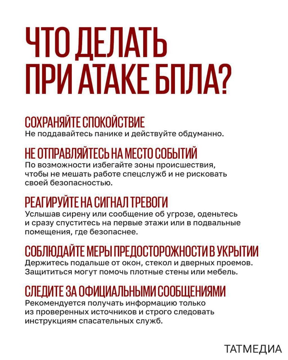 В ответ на пост ❕🛩Друзья, просим вас сохранять спокойствие в связи с оповещением от МЧС Делимся правилами, которые нужно соблюдать при атаке БПЛА: сохраняйте и делитесь с близкими. @tatmediaofficial