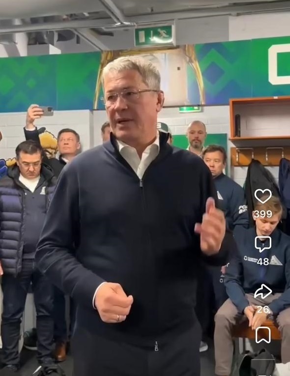 После вчерашней встречи «Салавата Юлаева» с «Локомотивом» глава Башкортостана Радий Хабиров, приехавший в Ярославль поболеть за нашу команду, заглянул к игрокам в раздевалку и тепло поблагодарил их за проведенный сезон. «Сегодня и в этом сезоне «юлаевцы» подарили нам отличный хоккей, — чуть позже написал руководитель региона в соцсетях. — От имени всей республики, от наших жителей, мальчишек и девочек, которые болеют за «СЮ», благодарю хоккеистов, тренерский штаб, руководство «Салавата Юлаева» и, конечно, компанию «Башнефть», которая все эти годы финансирует наш клуб». Радий Хабиров отметил: состоявшаяся игра против «Локомотива» была тяжелой. «Но ребята дали бой и показали себя настоящими мужиками», — подчеркнул он. — Поздравляю ребят с бронзовыми медалями. Уверен, впереди у нас много побед». Напомним, в Ярославле юлаевцы проиграли пятый матч серии со счетом 2:4. Итоговой результат противостояния — 4:1 в пользу «Локомотива». Фото: скриншот видео со страницы Радия Хабирова в соцсетях.
