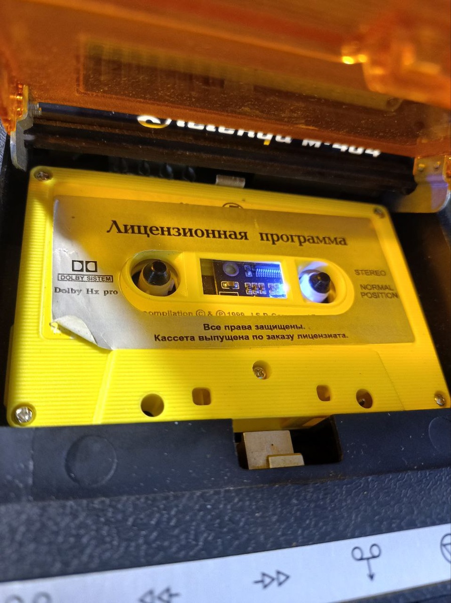 Про радио-кассету для магнитофона Легенда-404 писали уже многие. Не будем повторяться. В моей небольшой коллекции старых магнитофонов есть Легенда-404 с дополнительными контактами для радиокассеты. На поздних выпусках их уже не было. И вот решил я попробовать их задействовать - сделать аналог радиокассеты, но в качестве источника звука использовать блютуз-модуль. Внимательный читатель, скорее всего, заметил провод питания, подходящий к магнитофону слева в районе динамика. Действительно - блок питания на 9 Вольт встроен в магнитофон, чтобы не зависеть от батареек и неудобных внешних блоков питания. Кассету выбирал долго. Кассет много, но все по последней моде 90-х: прозрачные, из оргстекла, а поскольку монтаж предполагался временно-постоянный, решил выбрать кассету из непрозрачного пластика, чтобы спрятать "потроха". Нашлась одна такая - из желтого пластика с криво наклеенной наклейкой. Разобрал и переставил пленку с "Комиссаром" в другой корпус, где пленка была капитально пожевана о