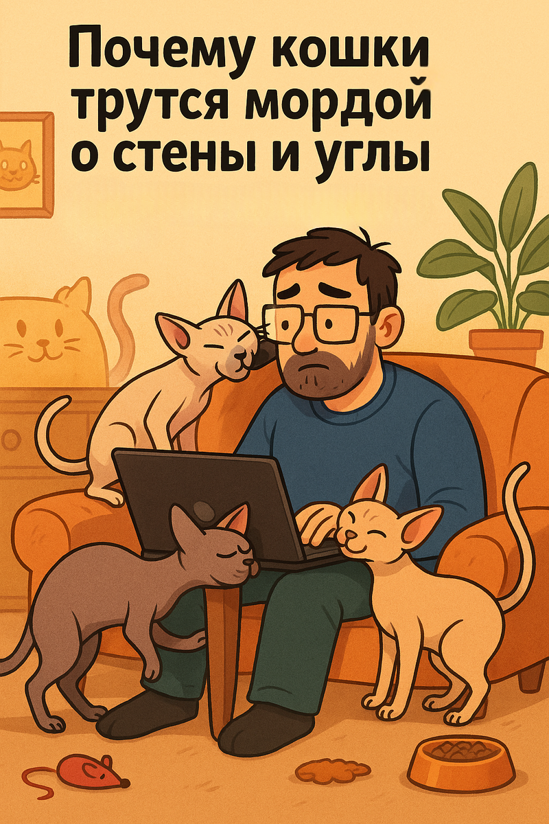 А ещё они смотрят в пустоту, ходят по клавиатуре и спят в раковине. Но сегодня поговорим только о трении мордой. Если у вас дома есть кот (а если вы читаете мой канал, то, скорее всего, не один), вы наверняка видели эту сцену: кот идёт по коридору, сворачивает к углу и с наслаждением трется об него щекой. Потом — о ножку стола. А потом — о... Да обо что угодно! Вопрос: что происходит? Ответ: не паниковать. Всё под контролем. Это один из тех кошачьих ритуалов, которые кажутся странными нам, но абсолютно логичны в котовселенной. Давайте разберёмся, зачем наши хвостатые так делают. И сразу скажу: моё личное мнение как многокотного отца (у меня их пятеро, напомню) подтверждают ветеринары и зоопсихологи. Так что держите пять причин, почему кошки трутся мордами обо всё подряд — от угла шкафа до вашей пятки. У кошек нет баллончика с краской, поэтому для меток они используют… своё лицо. В области щёк у них расположены специальные железы, которые вырабатывают феромоны — такие пахучие сигналы дл