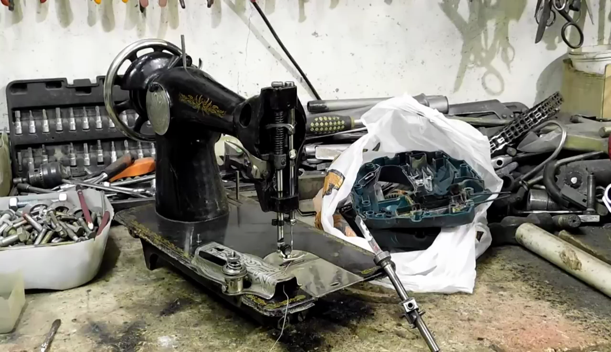 Мне от бабушки досталась старая швейная машинка. Она долго пылилась и в сторонке и наконец, я решил сделать из нее полезную вещь. Для изготовления сегодняшней самоделки нам понадобится старая сломанная швейная машинка и быстрозажимной патрон под пилки от сгоревшего электролобзика. Изначально из швейной машинки демонтируем все ненужные детали и механизмы. Теперь нам понадобится шток с быстрозажимным патроном под пилки от сгоревшего электролобзика. Сделаем разметку. Укоротим этот шток в размеченной области. Лишнее вытряхнем. В намеченной области просверлим отверстие диаметром 3 мм Теперь в штоке самой швейной машинки в размеченной области просверлим отверстие диаметром 3 мм и соединим заготовку. Прикрутим переднюю крышку обратно. Рассверлим внутреннее отверстие шкива от стиральной машинки до 20 мм и запрессуем его при помощи молотка на вал швейной машинки. Вырежем из куска ДСП подощву под швейную машинку. Предварительно сделав разметку вырезаем подошву. Просверлив отверстия, прикрутим по
