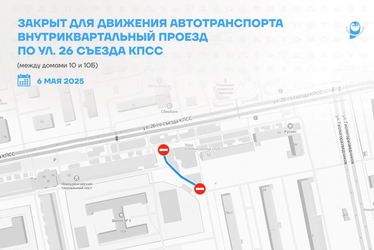 6 мая закрывается на ремонт внутриквартальный проезд между домами 10 и 10Б по улице 26 Съезда КПСС.