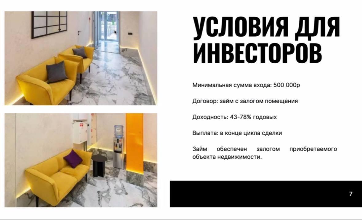 Сделка будет структурироваться через крауд-платформу с лицензией ЦБ, которая будет выступать залогодержателем. Таким образом все 28,4 млн р будут обеспечены залогом коммерческой недвижимости.