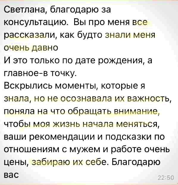 🌟🌟🌟🌟 💖 Консультация «Знакомство с собой» Почти 6 лет я помогаю женщинам становиться счастливее, узнавать себя и меняться, двигаться вперёд, превращая свою жизнь в жизнь мечты 〰️〰️ 💖 〰️ 💖 〰️〰️ Женщина из отзыва выше ⬆️пришла ко мне в сложный период своей жизни, когда потеряла работу и любимого мужчину. Не знала что ей делать и куда двигаться дальше Проанализировав её дату рождения, мы выяснили причины, почему она оказалась в такой ситуации. Раскрыли её сильные стороны, которые помогают ей сейчас двигаться дальше ☯️ Результаты: Уже буквально через две недели - нашла новую работу. Включился интерес к жизни Осуществила мечту - пошла на танцы раскрывать свою внутреннюю женщину 〰️〰️〰️〰️〰️〰️〰️〰️ В обычной жизни мы редко задумываемся над повторяющимися событиями-«граблями», мешающими нам быть счастливыми пока не набьем шишек. 2026 - Колесо фортуны будет обнажать нашу личную карму, помогать нам менять себя и свою жизнь Незнание и отсутствие осознанного включения будет давать безре