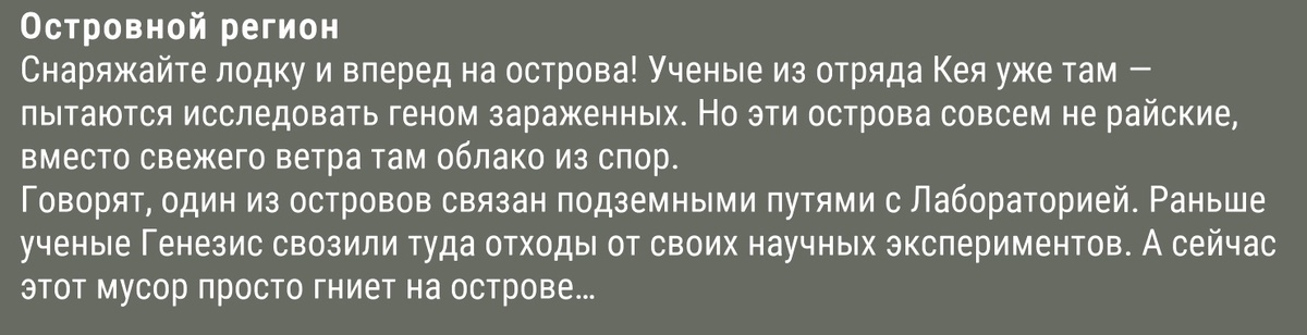 Всем привет. В игре вышло обновление, по масштабу сравнимое с выходом северного региона в 2024 году. Если игра будет развиваться такими темпами, то многие рискуют состариться и умереть так и не дождавшись "Пригорода" и вертолета. Итак, необходимо сначала выполнить квесты "Пути выжившего" - "Островной регион" У игроков уже прошедших весь путь, задания засчитаются автоматически и необходимо будет забрать награду: Из нового здесь получим: Ну и вдобавок дадут много чего полезного, особенно для начинающих: Теперь можно зайти в меню крафта и посмотреть на новые изготавливаемые оружие, броню и прочее. Для изготовления брони понадобятся новые ресурсы: плотная кожа (делается из плотных шкур островных оленей) и блокатор спор. Между прочим у каждой брони теперь появился новый показатель - защита от спор. Судя по всему работает по аналогии с северным регионом - чем сложнее остров, тем лучше нужна будет броня. Выбор правда невелик, но пока радует то, что можно немного избавиться от резины, линз и