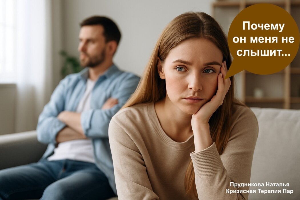 Ты говоришь — спокойно, по делу или со слезами. А в ответ — либо тишина, либо раздражение. Он кивает, но не помнит, не реагирует, не меняется. Возникает ощущение, что словно тебя не существует. И это больнее, чем ссоры. Потому что ссора — это хоть какой-то контакт. А тут — пустота. Эта статья — для тех, кто чувствует себя невидимой рядом с партнёром. И хочет понять: почему он не слышит, и можно ли что-то изменить? Когда женщина говорит: «Он меня не слышит», чаще всего она имеет в виду не то, что мужчина физически отсутствует. Он может сидеть рядом, кивать, повторять слова. Но эмоционально он не рядом. Он где-то в стороне. В себе. В логике. В телефоне. Или в том, чтобы «не делать из мухи слона». Женщина хочет быть услышанной, а не разобранной по пунктам. Хочет, чтобы её чувства увидели, а не поставили под сомнение. Чтобы не исправляли, а остались рядом в этот момент. Причин может быть несколько и все они глубже, чем кажется: Марина (имя изменено) пришла на сессию с фразой: «Мне кажется,