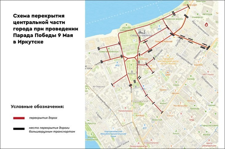 Время гулять пешком: 9 мая улицы в центре Иркутска перекроют Ряд улиц в центре Иркутска закроют для проезда на время проведения мероприятий, посвященных 80-й годовщине Великой Победы. Ограничение продлится с 6:00 до 23:00. Нельзя будет проехать по Ленина от Желябова до Сурикова, по Сухэ-Батора от Карла Маркса до Нижней Набережной, а также по площади графа Сперанского. Во время праздничного салюта закроют для проезда транспорта Глазковский мост. 9 мая в Иркутске пройдет шествие по акции «Бессмертный полк России». На время формирования колонны и проведения мероприятия с 6:00 до 13:00 также перекроют несколько улиц. Проезд запретят по Декабрьских Событий от Карла Маркса до Нижней Набережной, по Нижней Набережной от Декабрьских Событий до Сухэ-Батора и по Рабочей от Декабрьских Событий до Франк-Каменецкого. Парковать транспорт запретят в радиусе 500 метров от мест перекрытия. Будет работать эвакуатор. Водителей просят заранее планировать маршрут и выбирать альтернативные пути. Бесплатна