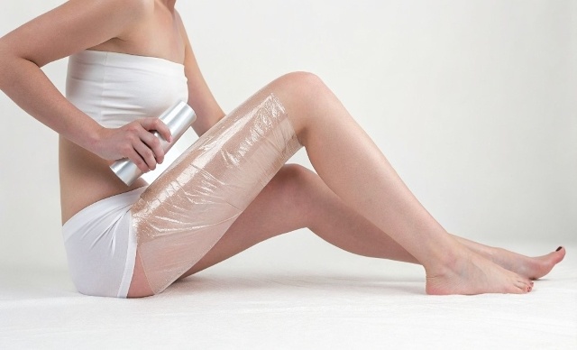 - После распределения косметического средства участок тела оборачивается пленкой для обертывания тела, начиная снизу вверх.