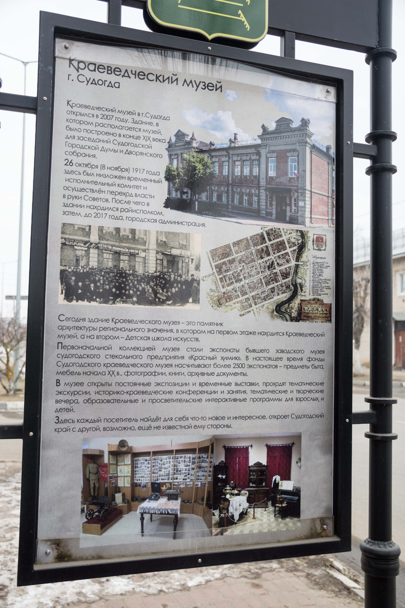 Я давно заметила, что почти в каждом районном центре нашей необъятной страны есть Краеведческий музей или что-то подобное. Вот и в Судогде специалисты-энтузиасты создали в 2007 году свой Краеведческий. Расположен в здании бывшей Судогодской Городской Думы и Дворянского Собрания. Ныне здесь находится не только музей (он на первом этаже), здание большое. Со стороны Второго Первомайского переулка можно войти в Администрацию города, Совет Народных депутатов Судогды и разные другие значимые для города организации. Там же и парковка. Адрес музея: ул. Ленина, д. 65. Еще в этом доме располагается Детская Школа Искусств.