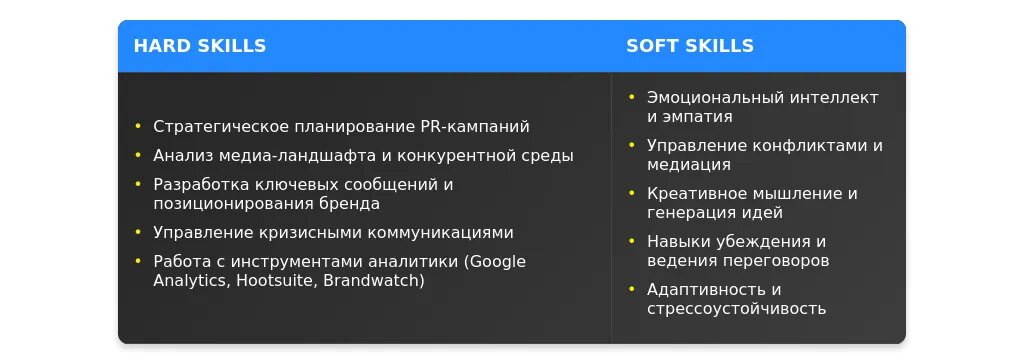 - Акцент на навыках: управление кризисными коммуникациями, медиапланирование, стратегическое мышление.