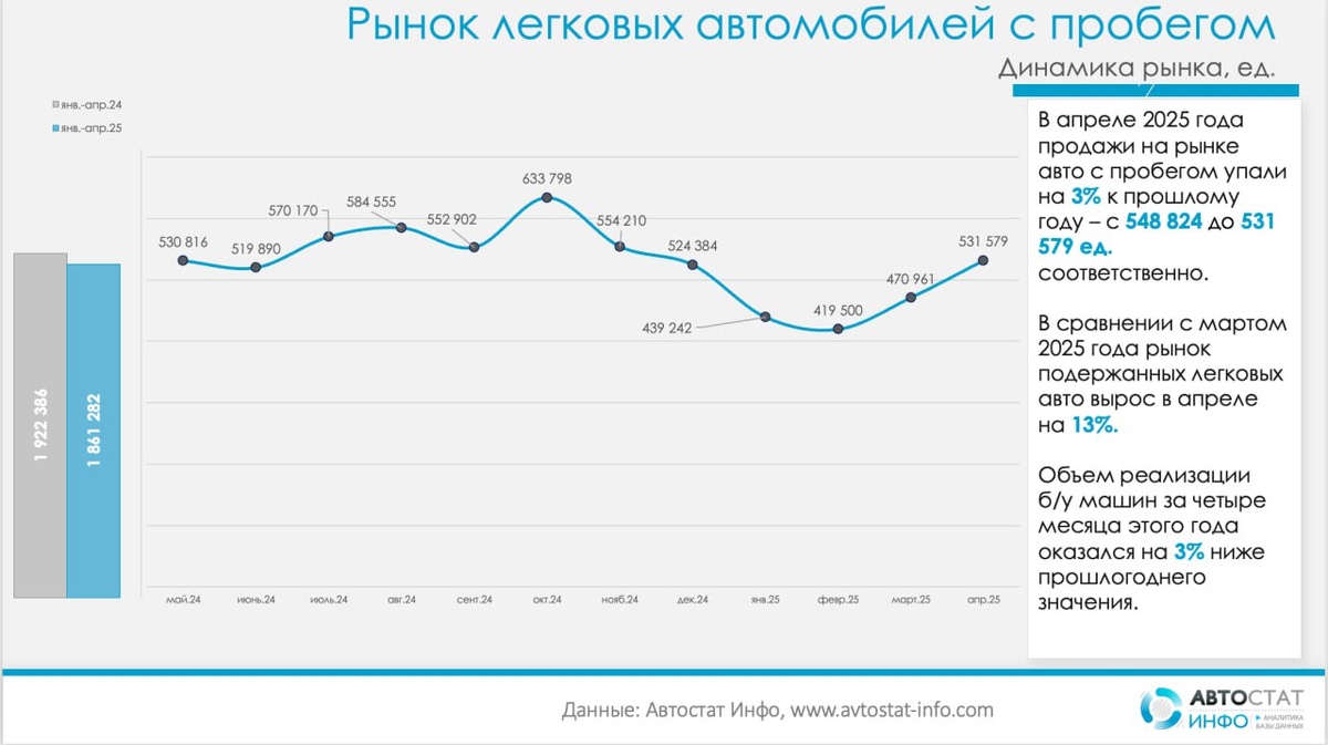 Продажи подержанных легковых автомобилей в апреле: рост к марту на 13% Согласно данным «Автостат Инфо» за апрель 2025 года, объем рынка легковых автомобилей с пробегом в России сократился на 3% по сравнению с аналогичным периодом 2024 года — с 548 824 до 531 579 единиц. Однако, апрельский результат оказался на 13% выше, чем в марте 2025 года, когда было продано 470 961 автомобиль. Таким образом, вторичный рынок продолжил рост, начавшийся в феврале после январского спада продаж. С начала года и по апрель включительно в стране было реализовано 1 861 282 легковых автомобиля с пробегом, что на 3% ниже показателя за аналогичный период 2024 года (1 922 386 единиц). В структуре перерегистраций на долю российских автомобилей в апреле пришлось 30%. Этот сегмент показал рост на 1% по сравнению с апрелем прошлого года, увеличившись с 159 240 до 160 755 единиц. В то же время рынок подержанных иномарок снизился на 5% в абсолютных величинах (с 389 584 до 370 824 единиц), заняв 70% всего вторичног