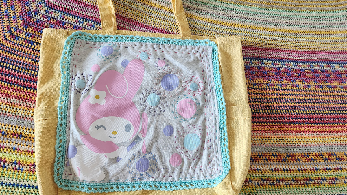 Вторая жизнь старых вещей с пользой Если у вас есть любимая футболка с принтом в хорошем состоянии, то посмотрев видео, вы можете дать этой футболке вторую жизнь. Вы можете использовать этот принт в виде декоративного элемента, добавив к нему декоративную стежку, и украсить сумку-шоппер или наволочку. А вообще это отличная идея с принтом футболок. Порезать на полоски не получится, и выкинуть жалко. А тут можно на сумку, наволочки или покрывало летнее приспособить. Можно фрагменты принтов обвязать крючком и соединить их в полотно, или же сшить между собой. Я пробовала использовать принт на сумках и наволочках. Для больших по объёму проектов у меня нет столько интересных принтов.