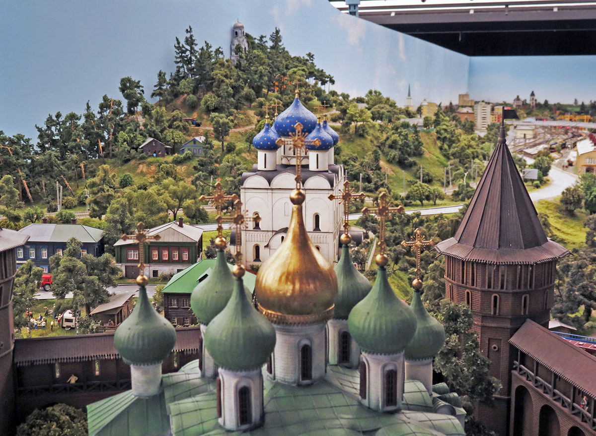 В Москве много необычных достопримечательностей. Например, «Царь-Макет», который его создатель Вадим Авилов однажды назвал "попытка экранизации моего романа о любви к России". Саму идею макета страны (само собой, не нашей) он случайно увидел Гамбурге, затем впечатлился Гранд-макетом в Петербурге и даже предлагал владельцам перевезти его в Москву... но в итоге понял, что один макет России - хорошо, но два - ещё лучше. И вот в 2021 году результат многолетних трудов его команды был представлен публике. В невзрачном здании на ВДНХ - только не на самой выставке, а в её районе, в противоположной стороне от станции метро. И здесь пожалуй тот случай, когда первая достопримечательность - цифры. В кольцевом помещении в масштабе 1:87 - 2,5 километра железных дорог (ширина которых служит эталоном для всего остального), более 700 зданий, 750 машин, локомотивов и вагонов (многие, особенно крупные, в которые можно вставить больше "умной" начинки, ездят) и около 100 000 (!) "жителей", среди которых дв