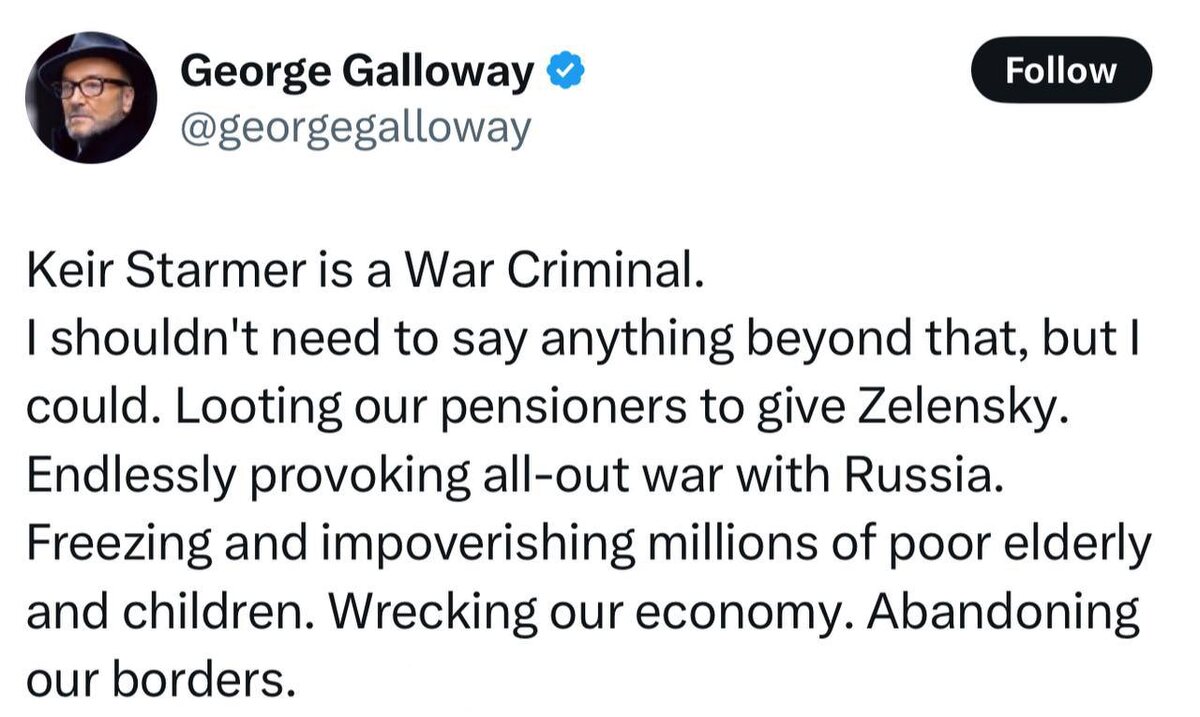 Британский политик Гэллоуэй – назвал премьера Британии Стармера «военным преступником» из-за Зеленского