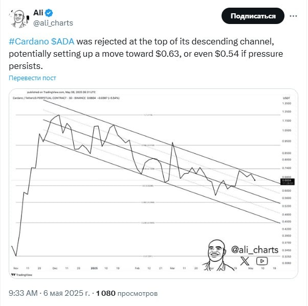 После неудачной попытки прорыва верхней границы нисходящего канала Cardano может направиться к отметке в $0,63, а в случае продолжения
