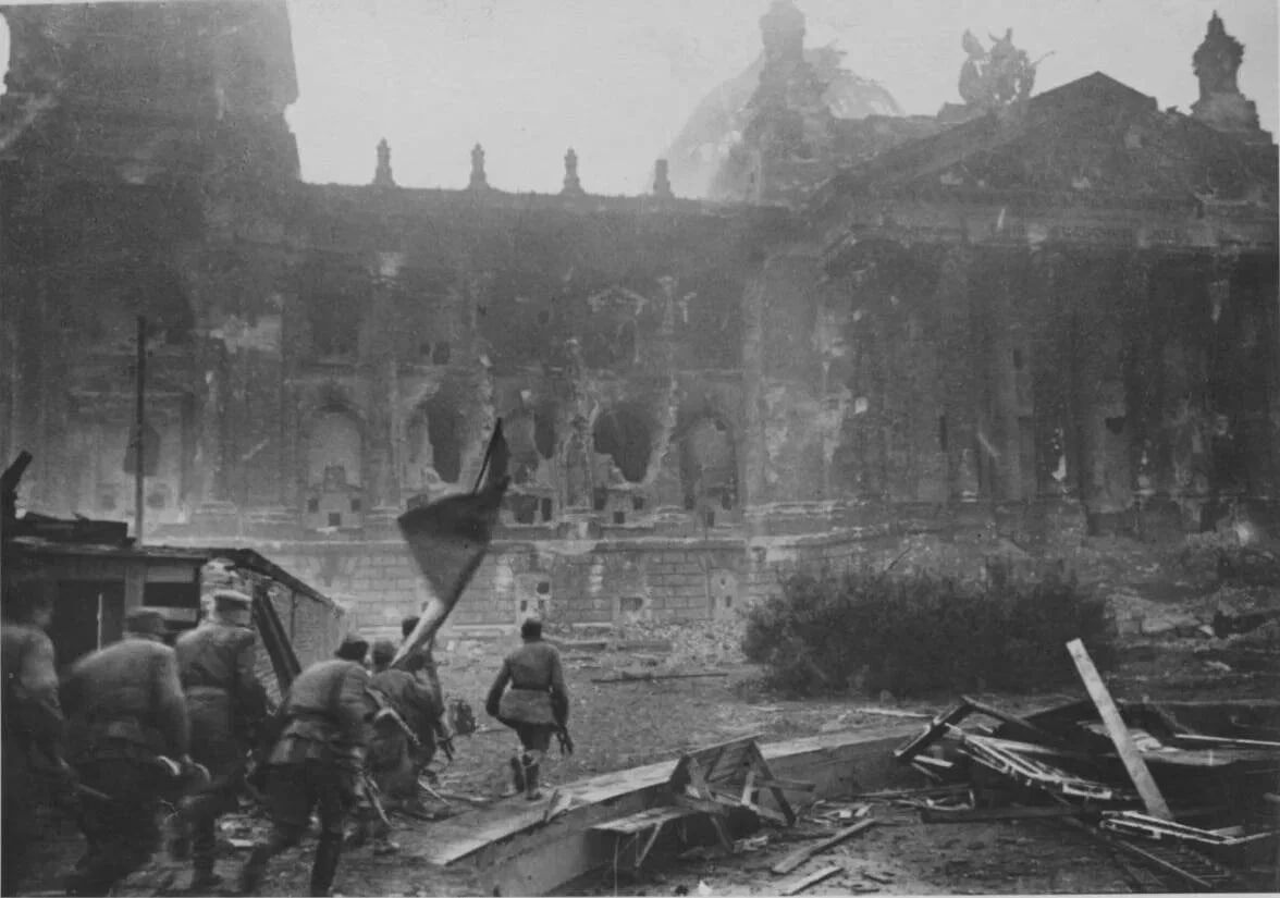 29 апреля советские солдаты очистили от противника здание швейцарского посольства, затем — здание Министерства внутренних дел, прозванное Домом Гиммлера. После мощной артиллерийской подготовки к утру 30 апреля здание было взято, путь на Рейхстаг был открыт. Вечером 30 апреля штурмовая группа в составе старших сержантов М.П. Минина, Г.К. Загитова, А.Ф. Лисименко и сержанта А.П. Боброва под командованием капитана В.Н. Макова нашла запертую дверь и выбила её бревном. Поднявшись на чердак, группа установила Красное знамя в отверстие короны скульптуры Богини Победы. Ранним утром 1 мая красноармейцы А.П. Берест, М.А. Егоров и М.В. Кантария при поддержке автоматчиков роты И.А. Сьянова вошли на крышу Рейхстага. Егоров и Кантария водрузили над зданием штурмовой флаг 150-й стрелковой дивизии, именно он стал Знаменем Победы. В 10 утра 1 мая немцы начали согласованную атаку сразу несколькими подразделениями как изнутри здания, так и снаружи. Начался пожар. Бой продолжался до позднего вечера, т