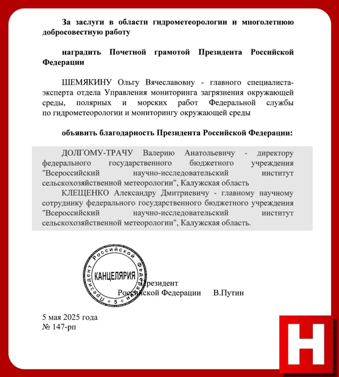 Π·Π° Π·Π°ΡΠ»ΡΠ³ΠΈ Π² ΠΎΠ±Π»Π°ΡΡΠΈ Π³ΠΈΠ΄ΡΠΎΠΌΠ΅ΡΠ΅ΠΎΡΠΎΠ»ΠΎΠ³ΠΈΠΈ ΠΈ ΠΌΠ½ΠΎΠ³ΠΎΠ»Π΅ΡΠ½ΡΡ Π΄ΠΎΠ±ΡΠΎΡΠΎΠ²Π΅ΡΡΠ½ΡΡ ΡΠ°Π±ΠΎΡΡβ ΡΠΎΡΡΡΠ΄Π½ΠΈΠΊΠΈ ΠΡΠ΅ΡΠΎΡΡΠΈΠΉΡΠΊΠΎΠ³ΠΎ Π½Π°ΡΡΠ½ΠΎ-ΠΈΡΡΠ»Π΅Π΄ΠΎΠ²Π°ΡΠ΅Π»ΡΡΠΊΠΎΠ³ΠΎ ΠΈΠ½ΡΡΠΈΡΡΡΠ° ΡΠ΅Π»ΡΡΠΊΠΎΡ
