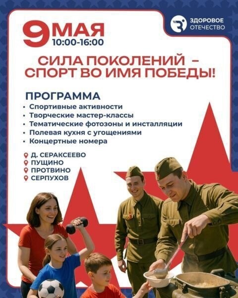 В Серпухове пройдут мероприятия цикла «Сила поколений — спорт во имя Победы!» В честь приближающегося 80-летия Великой Победы движение «Здоровое Отечество» приглашает жителей Серпухова, Протвино, Пущино и близлежащих деревень принять участие в праздничных мероприятиях, которые объединят разные поколения через спорт, творчество и память. 9 мая с 10:00 до 16:00 на четырёх площадках состоятся события цикла «Сила поколений — спорт во имя Победы!»: — деревня Сераксеево; — ТЦ «Плаза» (ул. Ворошилова, 130А); — парк «Зелёная зона» в Пущино; — мемориал «Рубеж обороны» в Протвино. Вас ожидают: Спортивные игры и активности для всей семьи; Мастер-классы для детей и взрослых; Концертная программа; Патриотические фотозоны и инсталляции; Полевая кухня.