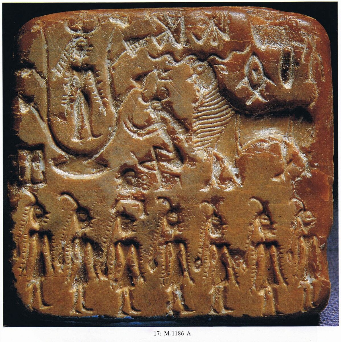 На фото: Печать, Мохенджо-даро, с изображением божества в рогатом головном уборе и с браслетами на обеих руках, стоящего на дереве пипал (священная смоква) и смотрящего вниз на коленопреклоненного почитателя (Музей Исламабада)