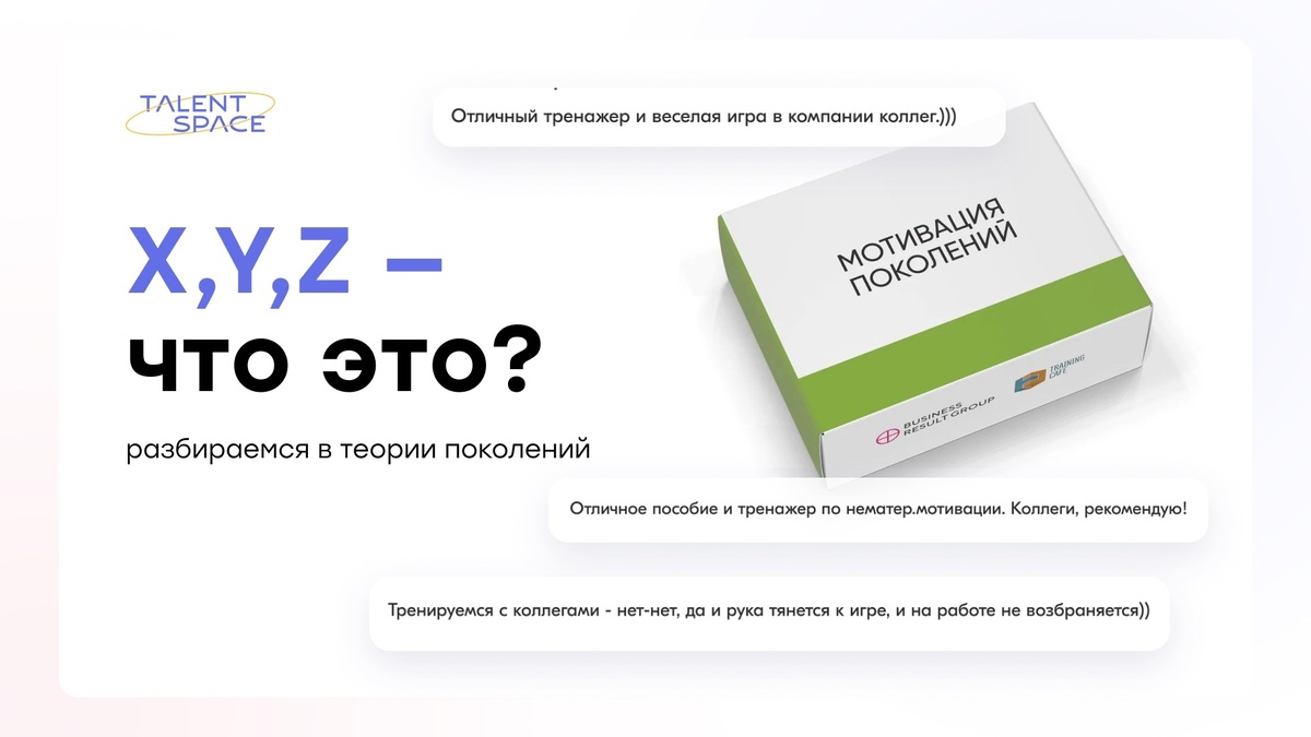 Теория поколений объясняет, как возраст влияет на мировоззрение и поведение людей. Например, бэби-бумеры верят в силу личных связей, миллениалы обожают гаджеты, а представители поколения Z считают себя глобальными гражданами. У каждого поколения — своя система ценностей. А это значит, что привлекательные мотиваторы вроде «дружного молодого коллектива» для кого-то из кандидатов могут не сработать. Знание теории поколений помогает выстроить коммуникацию с коллегами и подчинёнными, выбрать подходящие инструменты нематериальной мотивации. А чтобы не тратить время на описание всех поколений и объяснение коллегам, что это за три такие буквы, — обратитесь к игре «Мотивация поколений», благодаря которой вы сможете: 👉🏻различать мотивацию поколений, 👉🏻подобрать реально работающие инструменты мотивации. Игра не требует от вас и вашей команды долгих временных затрат. Возможно, вы уложитесь в 20 минут⏰