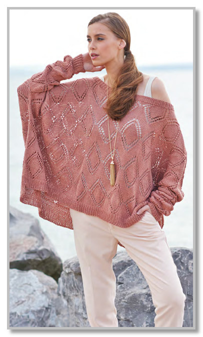 Ажурный узор с ромбами: 1-й ряд: 9 лиц. п., 2 вместе лиц., накид, * 1 лиц. п., накид, снять петлю, 1 лиц. п., psso, 15 лиц. п., 2 вместе лиц., накид, повторить от *, чтобы до последних 12 п., 1 лиц. п., накид, снять петлю, 1 лиц. п., psso, 9 лиц. п. 2-й и остальные четные ряды: изн. п.