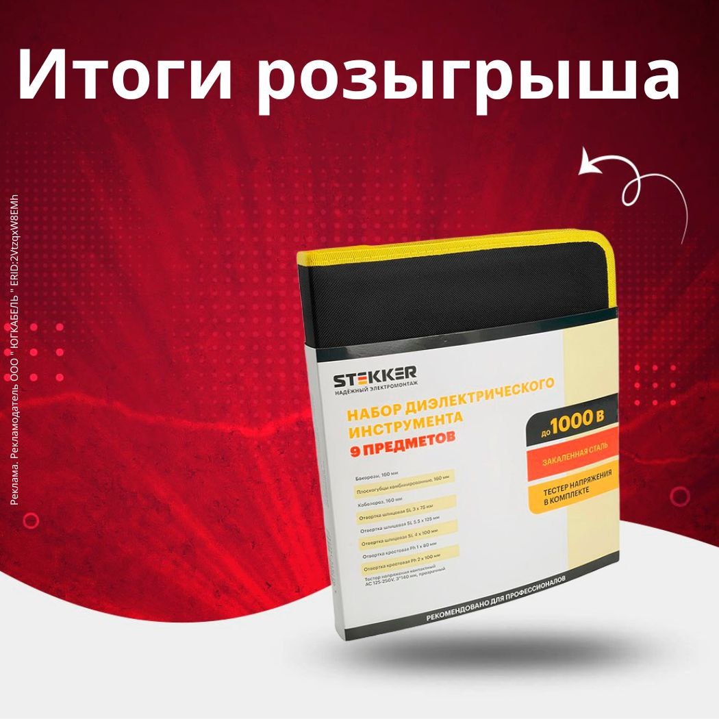Дорогие клиенты, партнеры ! Розыгрыш завершён, и мы объявляем победителей, выбранных случайным образом с помощью рандомайзера: 1⃣ Кокорин А. Е. выиграл набор диэлектрического инструмента 9 предметов 2️⃣ Егорушкина Светлана выиграла набор диэлектрического инструмента 7 предметов 3️⃣ Скурковин И. Д. выиграл набор диэлектрического инструмента 7 предметов Поздравляем! 🥳✨ Напоминаем, что в розыгрыше могли участвовать все наши клиенты юридические лица, которые приобрели продукцию торговой марки Stekker на сумму от 10 000 рублей с 1.03 по 30.04 Благодарим всех за активное участие и интерес к нашей акции! 🙌 Реклама. Рекламодатель ООО " ЮГКАБЕЛЬ " ERID:2VtzqxW8EMh
