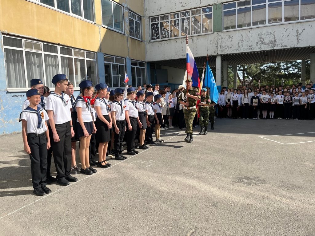 Школьники пришли на торжественную линейку в парадной форме, украшенной Георгиевскими ленточками, и с фотографиями своих прадедов — героев, сражавшихся за Родину в 1941–1945 годах.