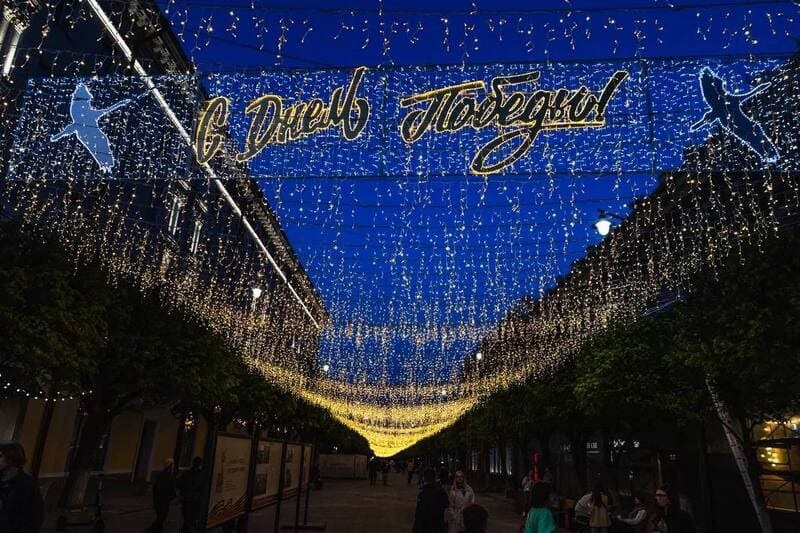 🌌 Пожалуй, самая впечатляющая фотозона расположена на улице Ленина, где горожан и гостей города будет встречать атмосферная инсталляция «Звездное небо» со светящейся растяжкой «С Днём Победы!».