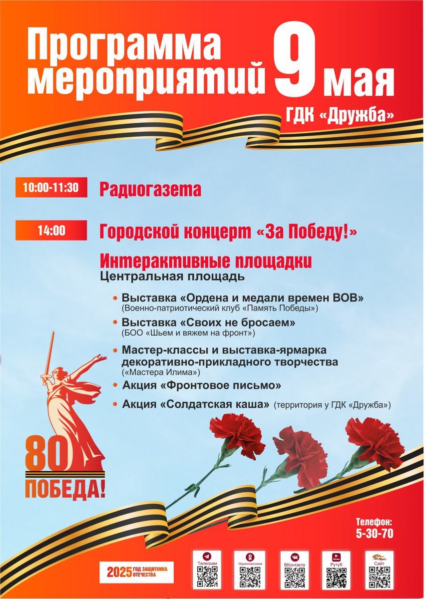 Программа мероприятий на 9 Мая от творческой команды Дворца культуры "Дружба" 10.00 -11.30 - радиогазета 14.00 - городской концерт "За Победу!" 14.00 - интерактивные площадки на центральной городской площади ➡️ выставка "Ордена и медали времен ВОВ" ➡️ выставка "Своих не бросаем" ➡️ мастер-классы и выставка-ярмарка от "Мастеров Илима" ➡️ акция "Фронтовое письмо"