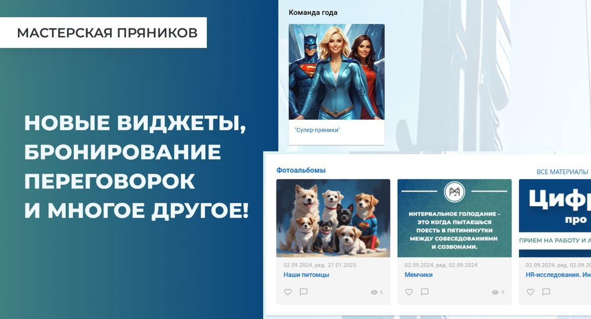 На платформе — свежие обновления! Теперь можно модерировать фото сотрудников, создавать доски почёта, собирать личные задачи из разных систем, листать контент прямо в виджете и бронировать переговорки с новым удобным календарём. Все новинки — в статье > blog.pryaniky.com/pryanichnye-novinki-0525