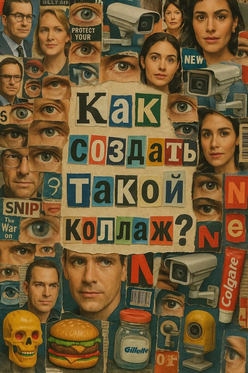 Промт для Sora или GPT Создайте визуально хаотичный коллаж, который выглядит как ручная работа и состоит исключительно из вырезок из журналов, наложенных и наклеенных на один лист бумаги. Бумага полностью заполнена - нет белого пространства - случайными вырезками лиц, рекламы, текста, изображений наблюдения, логотипов, глаз, камер и странных потребительских товаров, накладывающихся друг на друга в шумной, почти подавляющей манере. В центре коллажа - послание в стиле выкупа, составленное из букв, вырезанных из журналов: ["ваш текст".] Каждая буква набрана разным шрифтом, размером и стилем, некоторые прописные, некоторые строчные - как будто вырезаны из разных журналов. Буквы слегка смещены и наклеены с заметными пятнами клея, что придает им неровный, рукотворный вид. Некоторые даже слегка наклонены или наложены друг на друга. Скрытое послание (интегрированное тонко): В окружающем коллаже - на заднем плане среди вырезанных изображений и рекламы - некоторые буквы выделены, обведены,