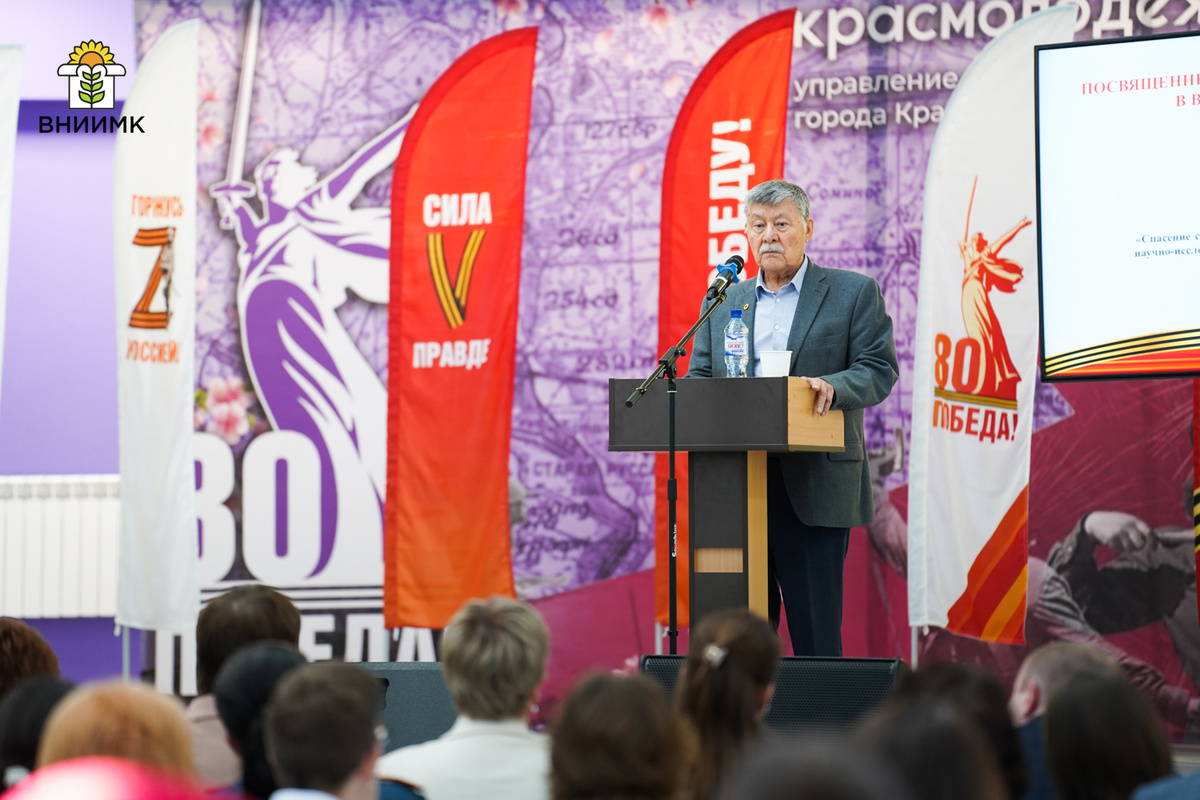 6 мая 2025 года в краснодарском Доме молодежи состоялся масштабный исторический форум, приуроченный к 80-летию Победы в Великой Отечественной войне. Участие в нем принял советник руководителя ВНИИМК Николай Иванович Бочкарёв. Мероприятие, организованное Государственным архивом Краснодарского края при поддержке региональных министерств и общественных организаций, собрало более 280 участников, включая ветеранов, представителей власти, молодежных движений и научного сообщества. Программа форума состояла из экспозиций на основе документов Государственного архива Краснодарского края – детских рисунков учащихся Краснодарского художественного училища с середины 30-х по 40-е годы ХХ века, фотографий, оружия и военной техники периода Великой Отечественной войны, а также презентаций и докладов о жизни на Кубани в военное время. В лекционной части форума были рассказаны истории о тяжелом труде работников путей сообщения, железной дороги, о подвигах женщин, в том числе работавших в подразделениях