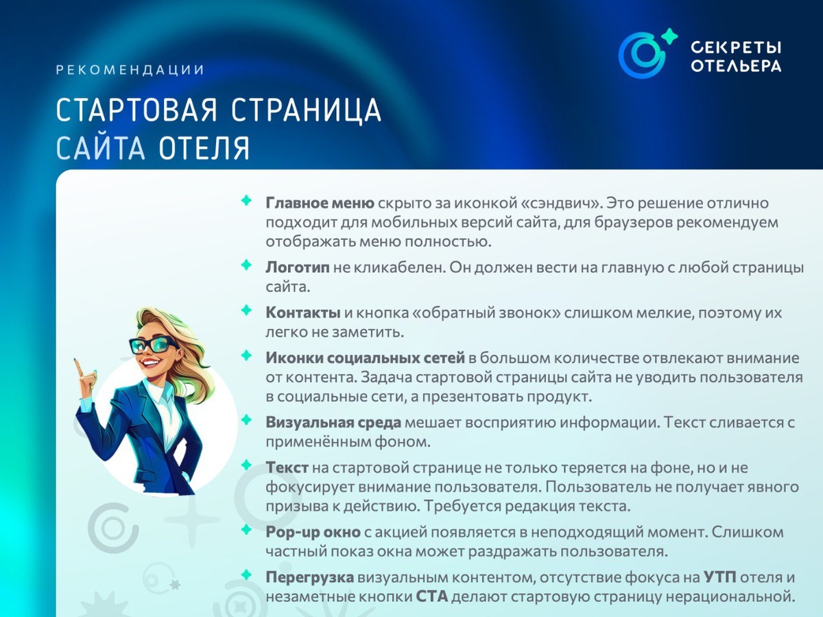 Проверьте стартовую страницу вашего сайта. Недавно мы закончили аудит продаж отеля, в рамках которого представили рекомендации по изменениям, которые требуется сделать на сайте отеля. Исследование сайта традиционно начинается со стартовой страницы, которая играет ключевую роль в формировании представления гостя об отеле и способна влюбить гостя в ваш отель или заставить его закрыть сайт навсегда. Скрытые меню, неработающие логотипы, крошечные кнопки, отвлекающие соцсети и визуальный хаос — всё это делает сайт не просто непродающим, а убыточным. Скрин показать не можем, но делимся частью рекомендаций из отчёта. Ставьте 👍, если согласны с замечаниями и спешите проверить ваш сайт. Возможно, настало время взглянуть на него свежим взглядом?