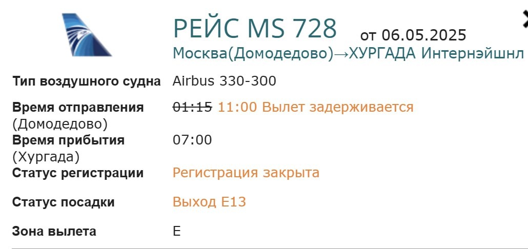 По данным онлайн табло Домодедово, до сих пор не отправлен в Хургаду борт Egypt Air. MS 728 должен был отвезти туристов на египетский курорт в 01:15, сейчас вылет ожидается с 10-часовой задержкой, в 11:00. На столько же отклонился от графика рейс Al Arabia в Шарджу. С 02:40 его перенесли на 13:00.