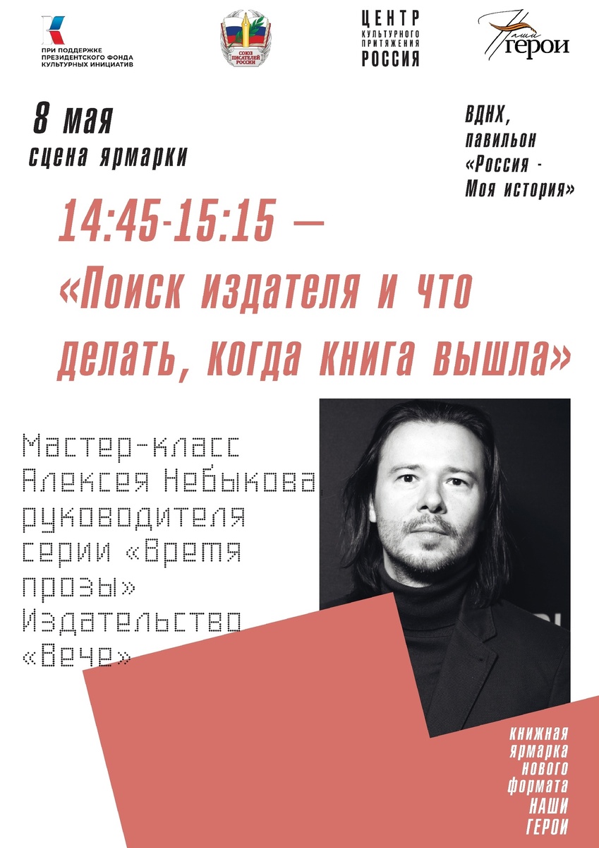 Приходите встречаться и подписывать книги. Я выступаю с полезным мастер-классом для писателей 8 мая с 14:45 до 15:15 на Сцене Ярмарки. Поговорим о поиске издателя, стратегиях автора (когда книга вышла), расскажу о собственных книгах и издательских проектах (серия «Время прозы»). На стенде издательства «Вече» все дни ярмарки будет продаваться наш сборник «Маяки». «Черный хлеб дорог» у издателя закончился, но у перекупщиков в сети еще можно заранее купить и подписать у меня на Ярмарке. Важный момент. На Ярмарке лучше со мной встретиться до выступления, до 14:45, потому что сразу после убегаю на семинары с молодыми писателями, где буду работать мастером и разбирать прозу. Поэтому приезжайте пораньше. Примерно с 14.00, думаю, точно можно будет уже найтись. На Ярмарке, кстати, каждый день планируется целый комплекс встреч, мероприятий, концертов. Ссылка на подробную программу! Ярмарка проводится Союзом писателей России, Советом молодых литераторов СПР при поддержке Президентского фонда кул