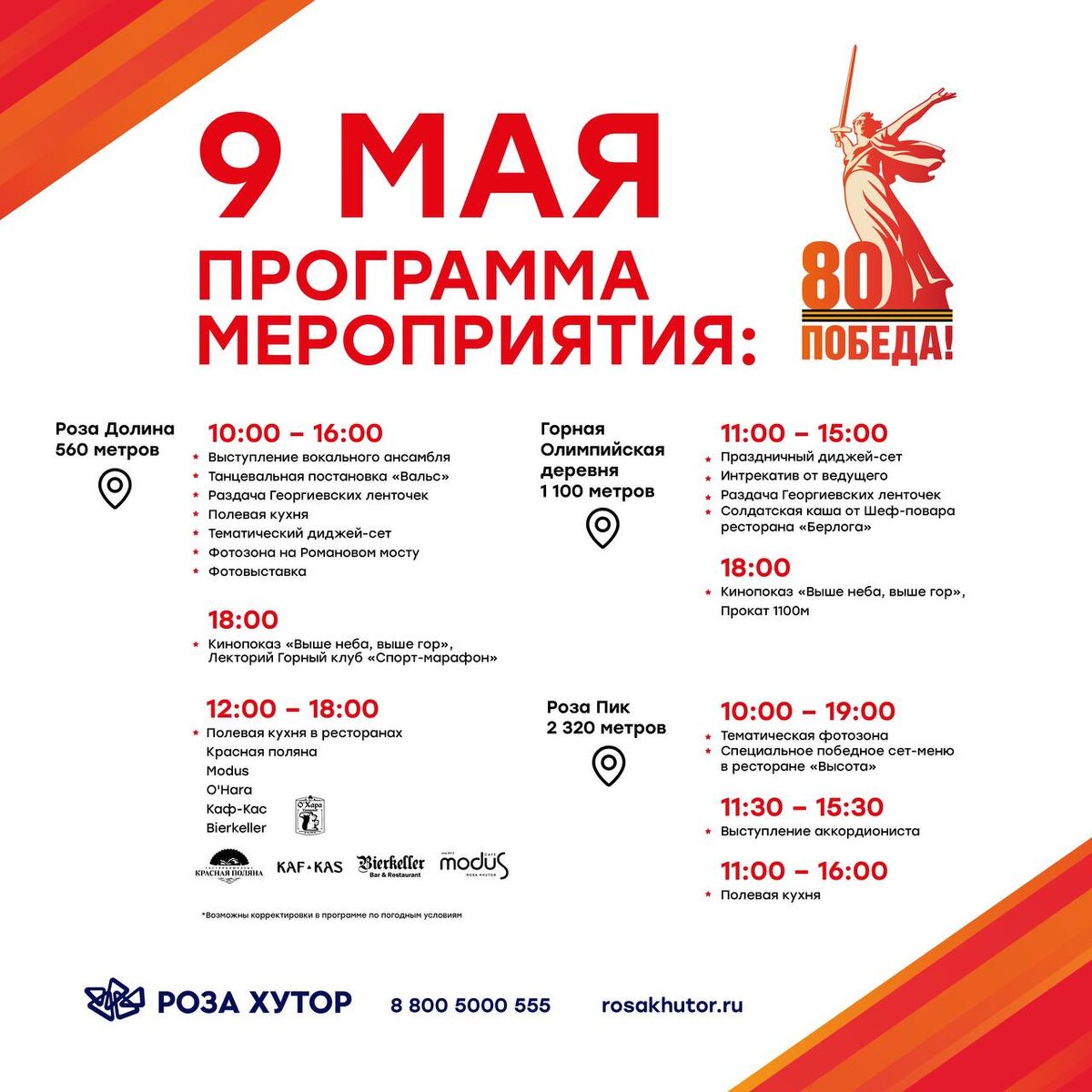 День Победы на Роза Хутор! 💪 Программа мероприятия: 📍 Роза Долина, 560м (10:00-16:00) 🖇 Выступление вокального ансамбля 🖇 Танцевальная постановка «Вальс» 🖇 Раздача Георгиевских ленточек для гостей курорта 🖇 Тематический диджей-сет 🖇 Фотозона на Романовом мосту, чтобы запечатлеть яркие моменты 🖇 Фотовыставка 🖇 Кинопоказ «Выше неба, выше гор» (18:00) 📍 Роза Долина, 560м (12:00-18:00) Полевая кухня в ресторанах: ✅ Красная поляна ✅ Modus ✅ O'Hara ✅ Каф-Кас ✅ Bierkeller 📍 Горная Олимпийская деревня, 1100м (11:00-15:00) 🖇 Праздничный диджей-сет 🖇 Интрекатив от ведущего 🖇 Раздача Георгиевских ленточек для гостей курорта 🖇 Солдатская каша от Шеф-повара ресторана «Берлога» 📍 Горная Олимпийская деревня, Прокат 1100м (18:00) 🖇 Кинопоказ "Выше неба, выше гор" 📍 Роза Пик, 2320м (10:00−19:00) 🖇 Тематическая фотозона 🖇 Специальное победное сет-меню в ресторане «Высота» 🖇 Выступление аккордиониста (11:30-15:30) 🖇 Полевая кухня (11:00−16:00)