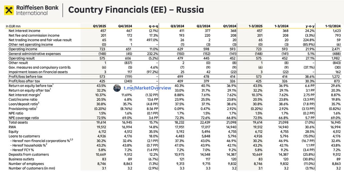 Доля прибыли российского Райфа в общем результате RBI составила 55,7% по итогам 1Q25, для сравнения в прошлых периодах: 1Q23 - 43%, 1Q24 - 45,2%. Прибыли дочек RBI в других странах упали, кроме Чехии и Словакии. Райффайзенбанк заработал €425 млн за I квартал 2025 г. (+30,3% к €326 млн за 1Q24)! отчет RBI по итогам 1Q24 Другие показатели: Ряд показателей продемонстрировали рост с начала года: Предположу, что это связано с переоценкой рублевых показателей в евро. С 31.12.24 по 31.03.25 курс евро по ЦБ упал на 15,5%. Курсовую разницу необходимо наложить и на сравнение с 1Q24, с тех пор курс евро к рублю упал на 10%. UPD: действительно в презентации отмечается влияние укрепления рубля. На самом деле за квартал в рублевом выражении депозиты сократились на 9%, кредиты - на 4%. pdf релиз | презентация | xls данные MarketOverview
