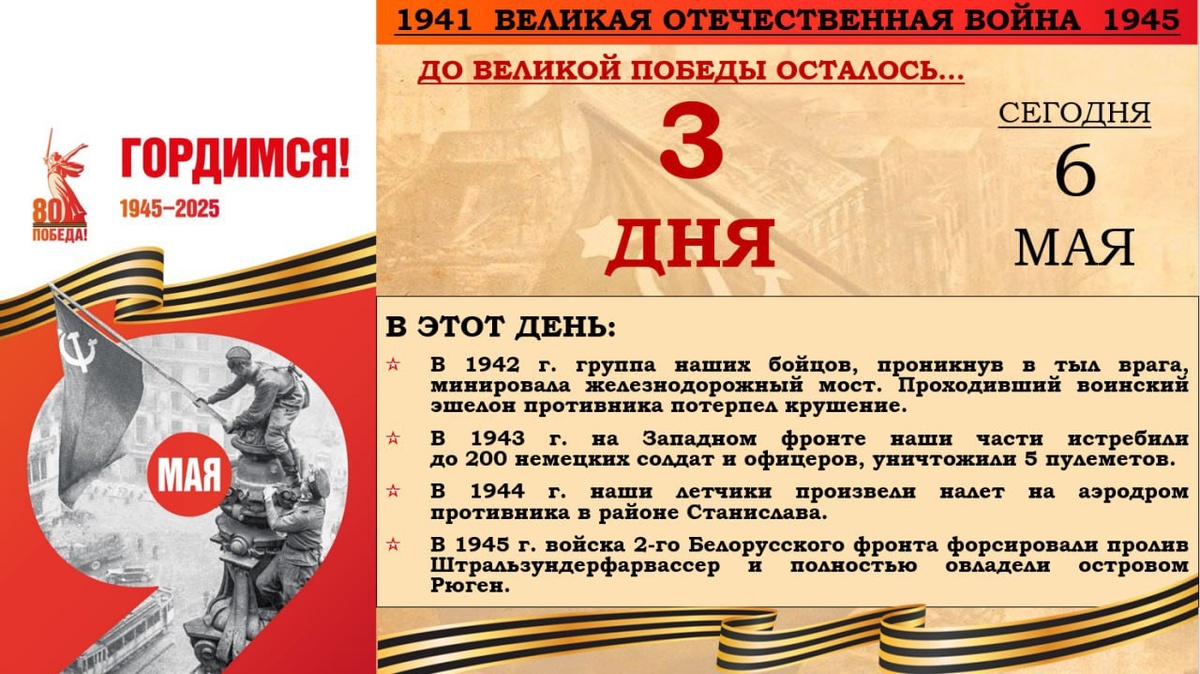 ⚡️ Годовщина Великой Победы приближается! В 1415 день войны, 6 мая 1945 года занят и зачищен от противника остров Рюген в Балтийском море. Освобождены населенные пункты Зандау, Вулькау, Клитц, Ферхель, Фиритц, Шлангентин, Плауе, Грос-Вустервитц, Каде, Каров. Подвижные войска Красной Армии устремились в направлении Праги с целью быстрейшего оказания помощи жителям города, восставшим против гитлеровских захватчиков. В рамках данной операции проведены: Дрезденско-Пражская, Судетская, Оломоуцкая, Йиглава-Бенешовская фронтовые наступательные операции. Освобожден в Чехословакии город Кромержиж. Капитулировал гарнизон крепости Бреслау (ныне город Вроцлав, Польша), насчитывавший 40 тысяч немецких солдат и офицеров. Отметим годовщину Победы советского народа в Великой Отечественной войне вместе!