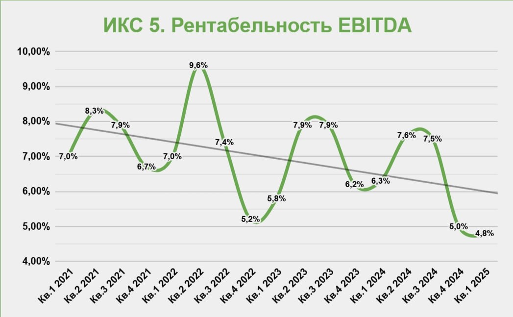 Компания отчиталась за 1 квартал 2025 года по МСФО и теперь мы можем посмотреть на динамику основных финансовых показателей и рентабельность👇 📊Результаты за 1кв 2025г: ✅Выручка выросла на 20,7% до 1,07 трлн руб. ❌Скор. EBITDA* (до МСФО 16) снизилась на 8% до 51,1 млрд руб. ❌Рентабельность EBITDA снизилась на 149 б.п. до 4,8% ❌Чистая прибыль снизилась на 24% до 18,4 млрд руб. *EBITDA снизилась на фоне опережающего роста расходов. В частности, расходы на персонал выросли на 36,7% год к году. 💰Денежный поток от основной деятельности сократился в 2,8 раза в основном из-за уменьшения кредиторской задолженности. С учетом роста капитальных затрат на 32% г/г свободный денежный поток ушёл в отрицательную зону и пришлось наращивать долговую нагрузку до 318,7 млрд руб. (+10,4% с начала года). ❗️По графику видно, что исторически первые кварталы у компании слабые, но при этом рентабельность EBITDA опустилась до минимальных уровней за последние 4 года. 👆Компания объяснила снижение рентабельност