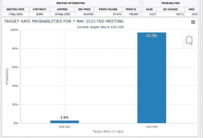 ФРС — в режим ожидания. Но надолго ли? Уже завтра — очередное заседание Федрезерва. И рынки почти единогласно говорят: ставка останется на уровне 4.25–4.50%. 97.2% трейдеров закладываются на статус-кво. Лишь 2.8% — на снижение. Это не просто статистика. Это про ожидания. Про то, насколько сильно рынок всё ещё боится инфляции… или же верит в «мягкую посадку». Но вот что важно: Если вдруг ФРС намекнёт на скорое снижение — это будет сигнал для всего рынка. Доллар начнёт слабеть, золото и биткоин — расти. Если же Джером Пауэлл продолжит говорить про “data-dependent approach” и будет жёстким — нас может ждать коррекция. Особенно в перегретых секторах. Однако ключевой вопрос не в решении по ставке. А в том, какой риторикой это решение будет сопровождаться. Пауэлл умеет менять настроение за 10 минут. И рынок ждёт именно этого — повода к развороту. Но получит ли? Будем следить не только за графиками, но и за макрофоном Пауэлла. Потому что именно оттуда начнётся следующий импульс. Ста