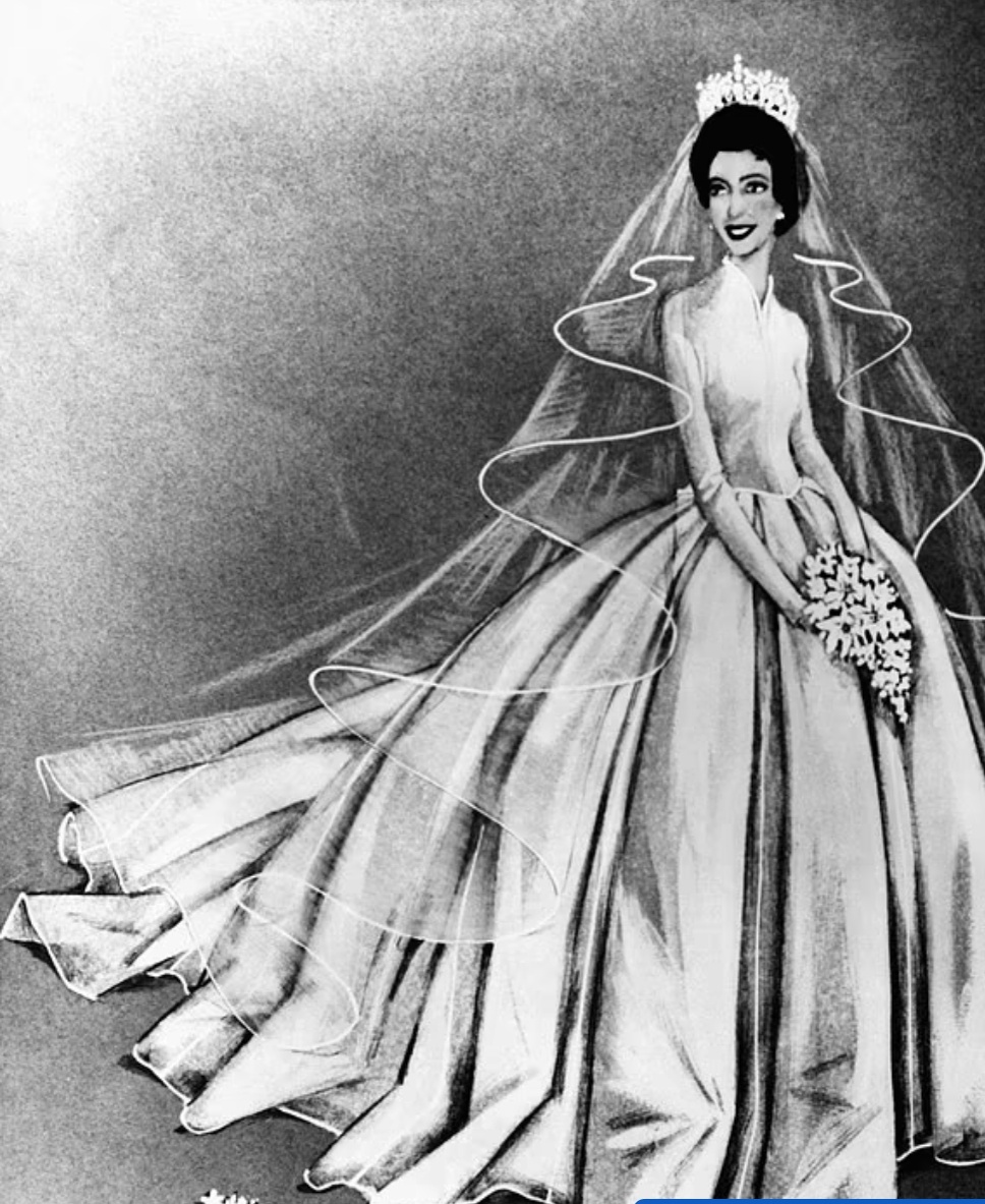 Принцесса Маргарет вышла замуж за Энтони Армстронг-Джонса, 1-го графа Сноудона, 6 мая 1960 года на торжественной церемонии в Вестминстерском аббатстве. Будучи первой королевской свадьбой, показанной по телевидению, она привлекла 300 миллионов зрителей по всему миру Тем временем около полумиллиона зрителей выстроились вдоль улиц в надежде увидеть принцессу, когда она будет ехать в аббатство в стеклянном экипаже. Маргарет поразила зрителей своим простым платьем цвета слоновой кости с скромным V-образным вырезом, зауженной талией и пышной юбкой из трёх слоёв органзы. Хотя Норман Хартнелл отвечал за создание платья, мало кто знает, что дизайн был придуман её будущим мужем, фотографом лордом Сноудоном. В своей книге «Элизабет и Маргарет» Эндрю Мортон рассказывает, что Энтони продемонстрировал свой художественный талант, нарисовав эскиз свадебного платья, прежде чем передать его портнихе. Автор подчёркивает, что простота платья означала отход от королевских традиций: на нём не было ни в