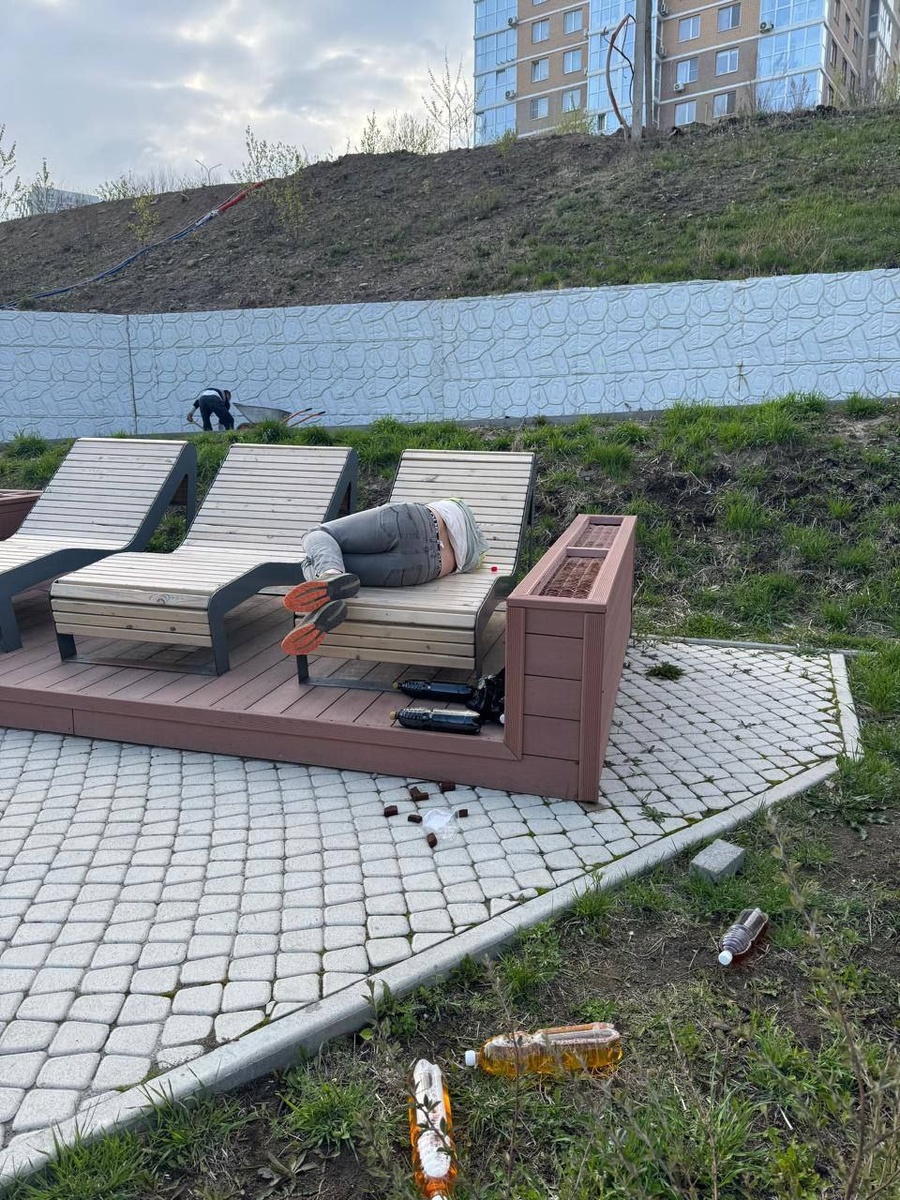 Яркое солнышко Патрокла уморило отдыхающего на шезлонгах Североморской 5к2... Количество напитков, судя по фото превысило его возможности, может друзья не пришли и он приуныл? 📍 @patrokl.info