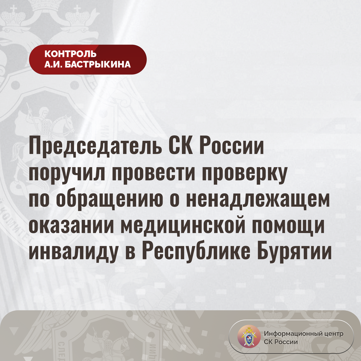 Председатель СК России поручил провести проверку по обращению о ненадлежащем оказании медицинской помощи инвалиду в Республике Бурятии В Информационный центр СК России поступило обращение по вопросу ненадлежащего оказания медицинской помощи инвалиду в Республике Бурятии. С января по февраль текущего года при проведении процедур мужчина был заражен инфекционным заболеванием, которое также было выявлено и у других пациентов. Однако меры к оказанию содействия пострадавшим в получении квалифицированного лечения не принимаются. Также отмечается, что мужчине не проводят необходимую процедуру в связи с имеющимся у него тяжелым заболеванием. Ситуация освещалась в СМИ. Председатель Следственного комитета Российской Федерации Александр Иванович Бастрыкин поручил руководителю СУ СК России по Республике Бурятии Евгению Вячеславовичу Лагацкому провести процессуальную проверку и доложить об установленных в ходе первоначальных проверочных мероприятий обстоятельствах, а по завершении проверки – о ее